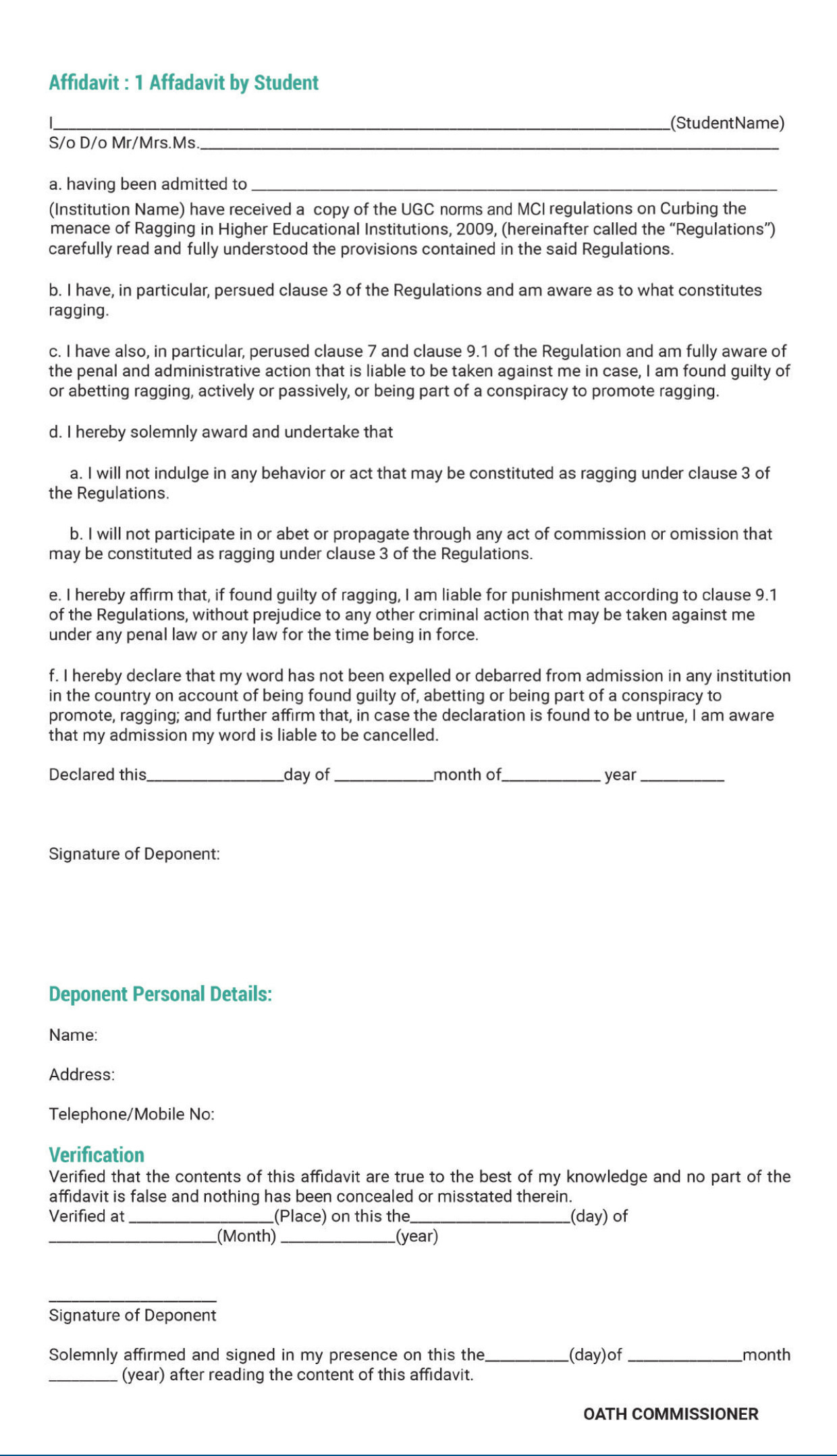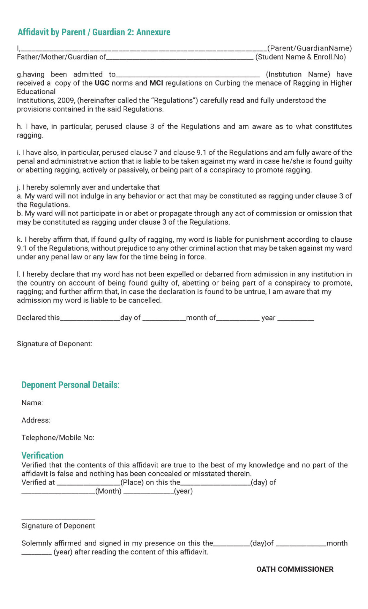 Note: On admission, the candidate must fill out online anti ragging Undertaking on the link www.antiragging.in/affidavit_registration_disclaimer.html